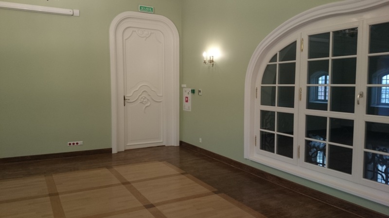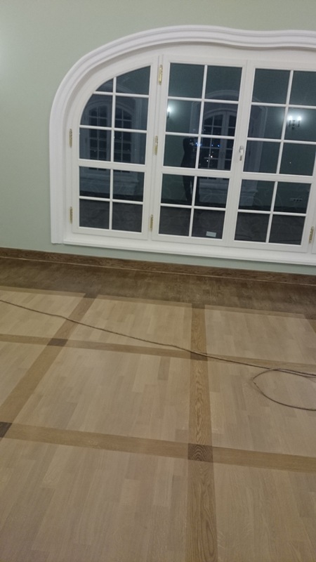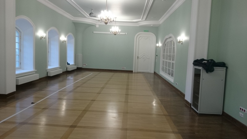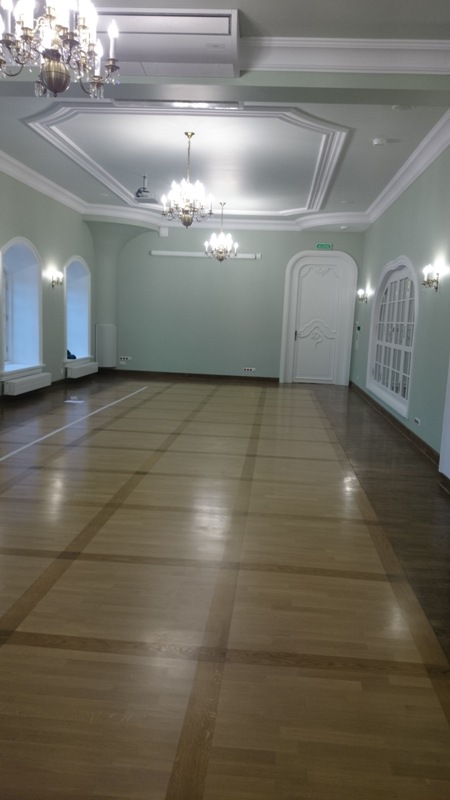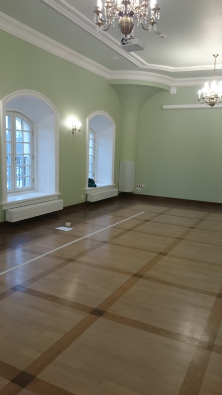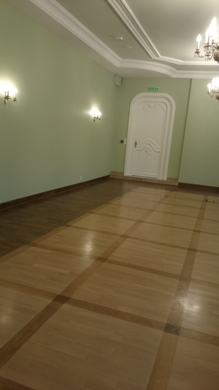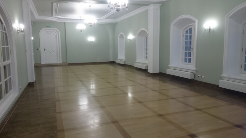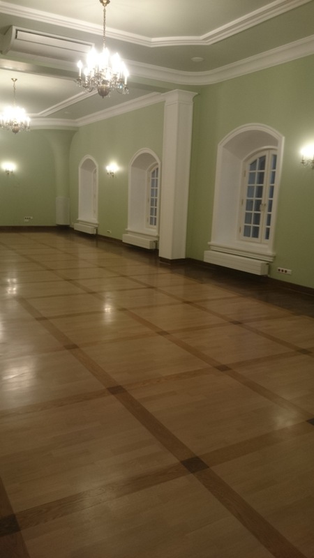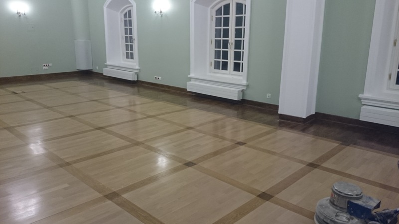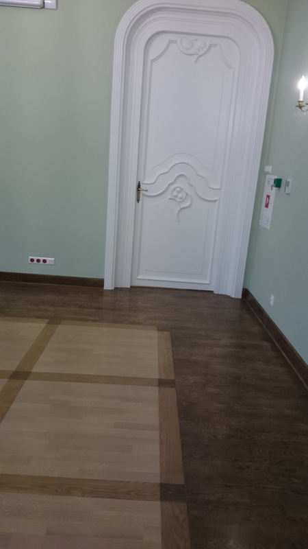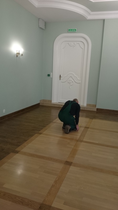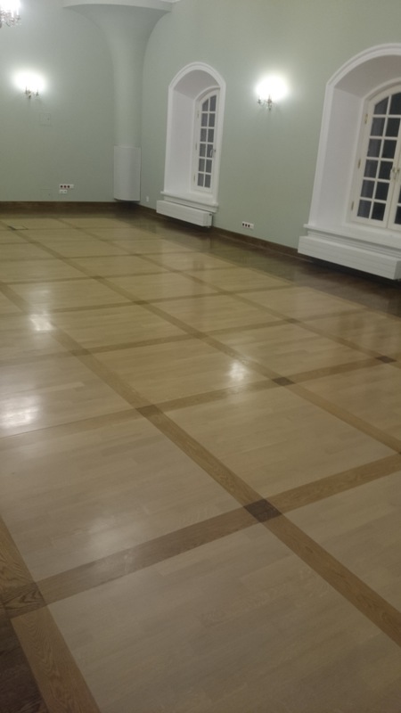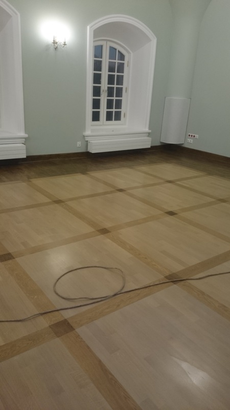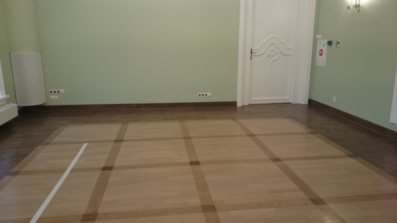 Inwestycja Pałac Branickich w Białymstoku (sala senatu). Układanie wzoru z parkietu i deski. Cyklinowanie i olejowanie podłogi w trzech kolorach przy współpracy z projektantem na zlecenie sklepu Olga Invest Białystok. Zastosowano oleje firmy Saicos. Zdjęcia przedstawiają kolejne etapy praz parkieciarskich.