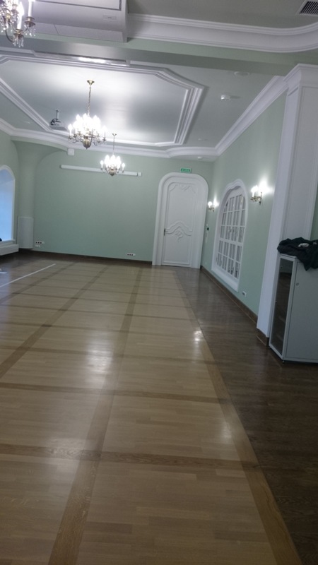 Inwestycja Pałac Branickich w Białymstoku (sala senatu). Układanie wzoru z parkietu i deski. Cyklinowanie i olejowanie podłogi w trzech kolorach przy współpracy z projektantem na zlecenie sklepu Olga Invest Białystok. Zastosowano oleje firmy Saicos. Zdjęcia przedstawiają kolejne etapy praz parkieciarskich.